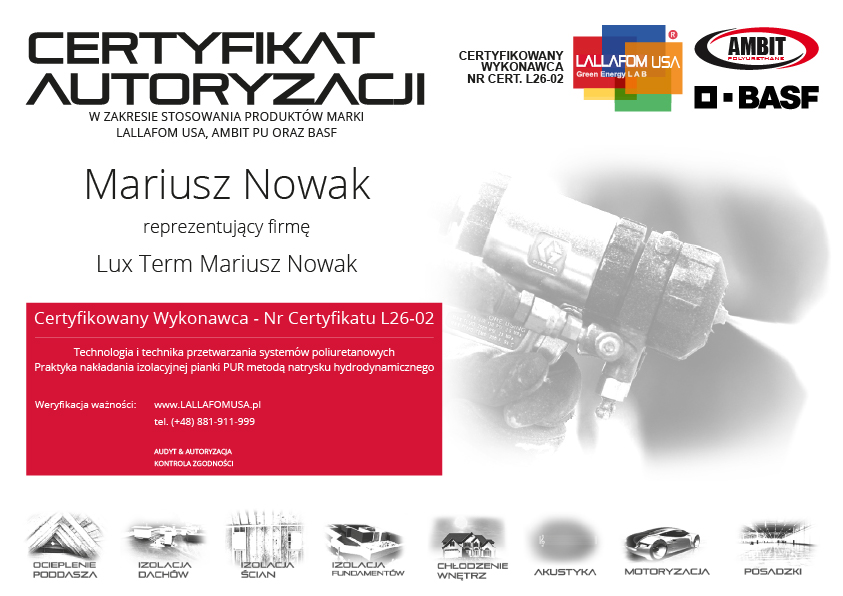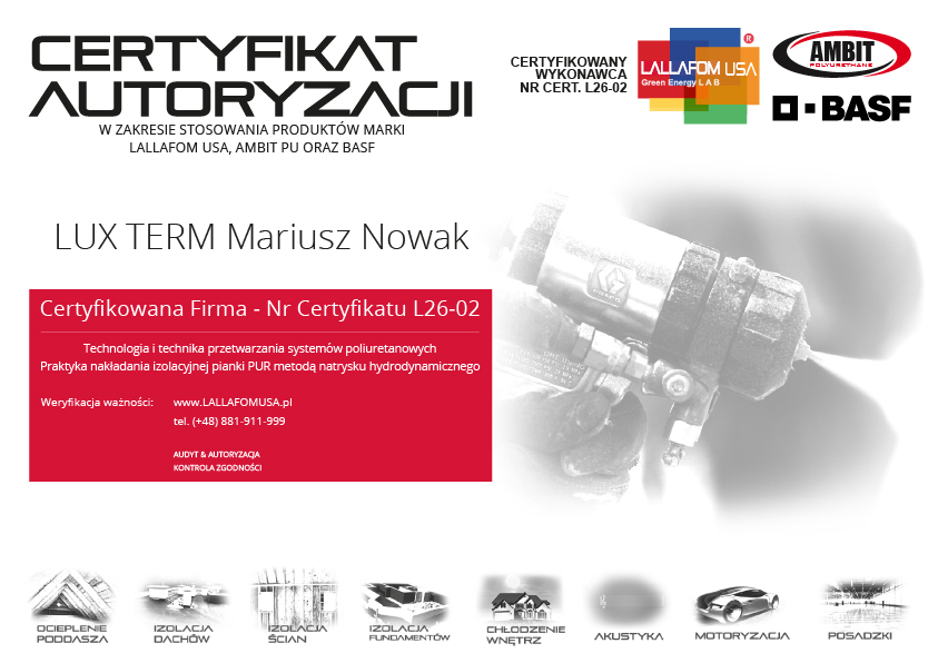 Oryginalne pianki LALLAFOM® USA są do nabycia wyłącznie u Autoryzowanego, Certyfikowanego Wykonawcy. Jeżeli otrzymasz ofertę na te produkty z innego źródła lub będziesz miał jakiekolwiek wątpliwości, skontaktuj się z Przedstawicielem LALLAFOM® USA w Polsce, dzwoniąc pod numer +48 881 911 999 lub wysyłając e-mail na adres info@LALLAFOMUSA.com. Zweryfikujemy wówczas dla Ciebie autentyczność oferowanego Ci produktu oraz kompetencje firmy natryskowej. Bądź świadomy za co płacisz i zapobiegaj łamaniu prawa budowlanego!